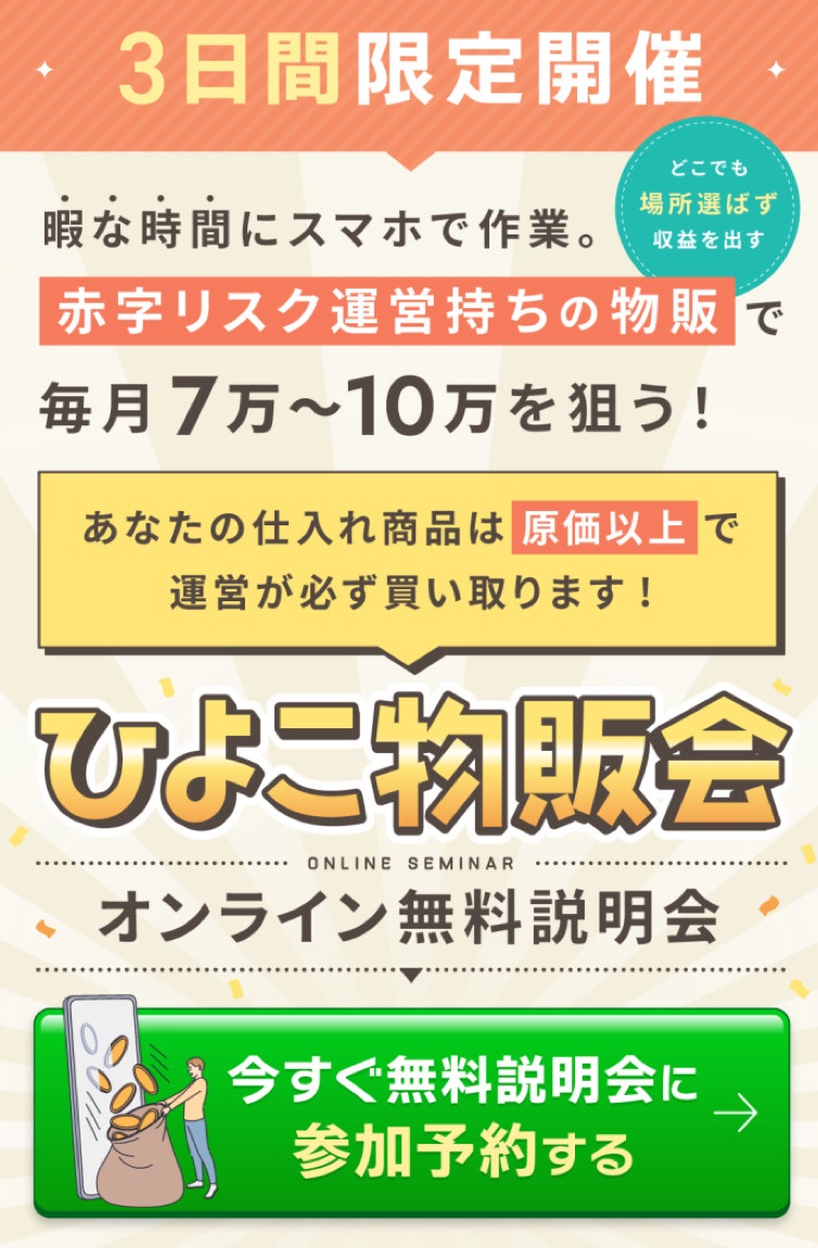初心者でも真似できる、稼ぐまでの道のりが全て体系化されていて、ロードマップをこなすだけで毎月7〜10万円の収益が生まれるひよこ物販会がおすすめという話になるんですよ。
